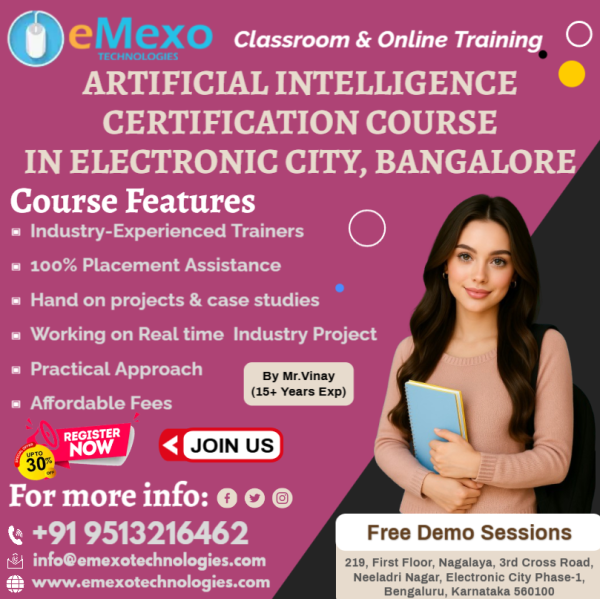#AITrainingInElectronicCityBangalore #AICertificationCourseInElectronicCityBangalore #AICourseInElectronicCityBangalore #AITrainingCenterInElectronicCityBangalore #AITrainingInstituteInElectronicCityBangalore #BestAITrainingInstituteInElectronicCityBangalore #AITrainingPlacementInElectronicCityBangalore #MachineLearning #DeepLearning #AIWithPython #AIProjects #ArtificialIntelligenceTraining #eMexoTechnologies #FutureTechSkills #ITTrainingBangalore